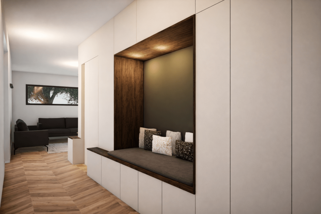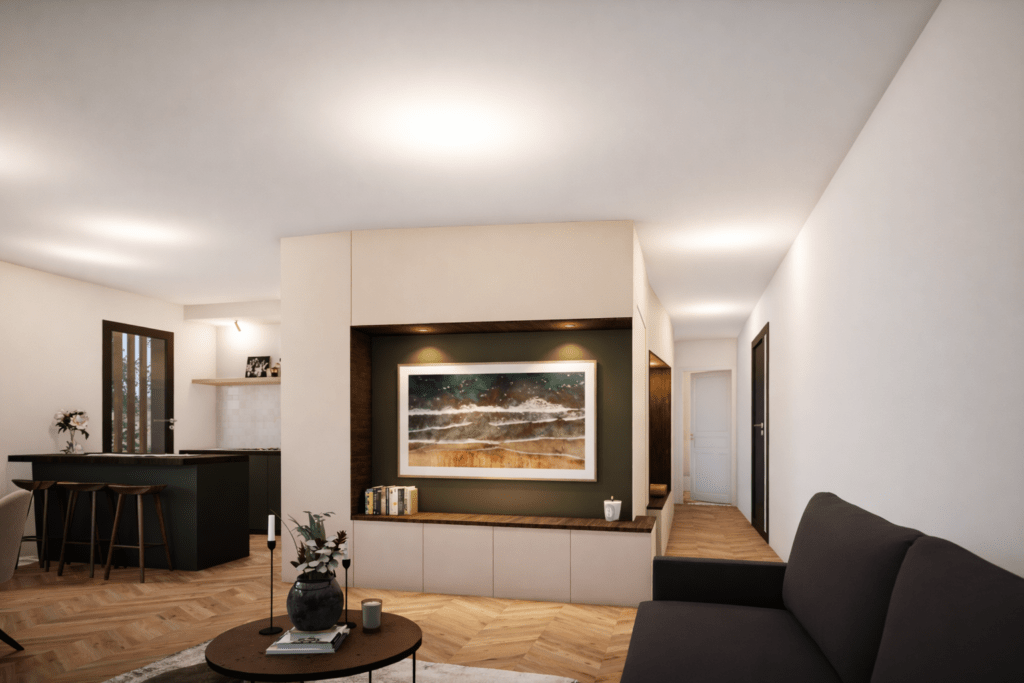 L’entrée, soigneusement composée, s’organise autour d’un bloc technique central, enveloppé de fonctions d’usage : assise, rangements et dressing. Elle conduit naturellement vers une grande pièce de vie lumineuse et conviviale.