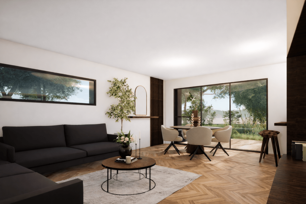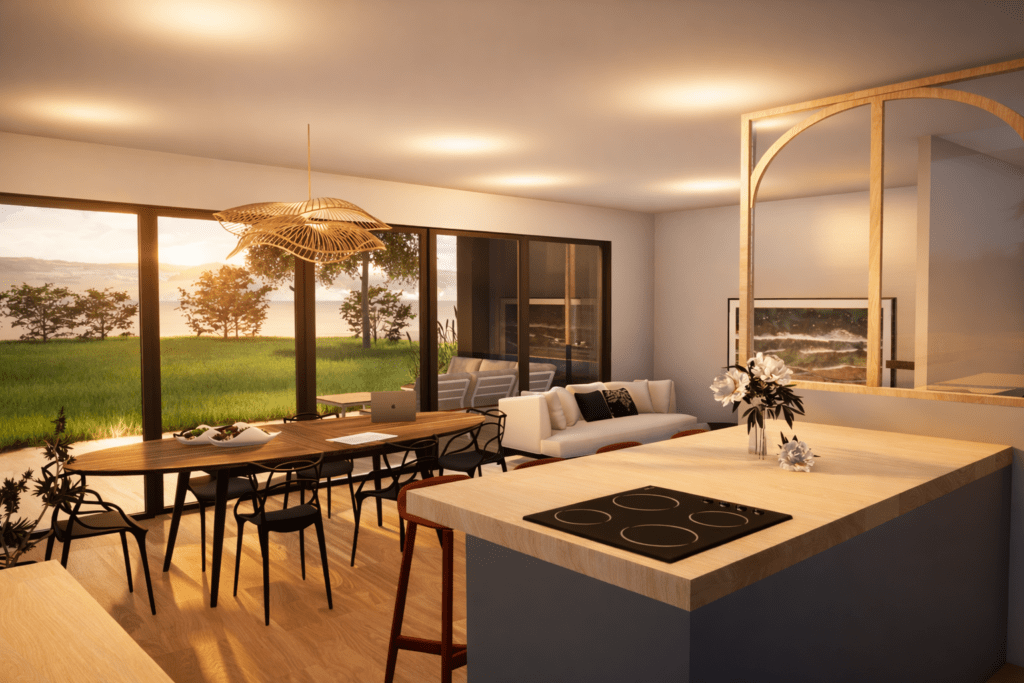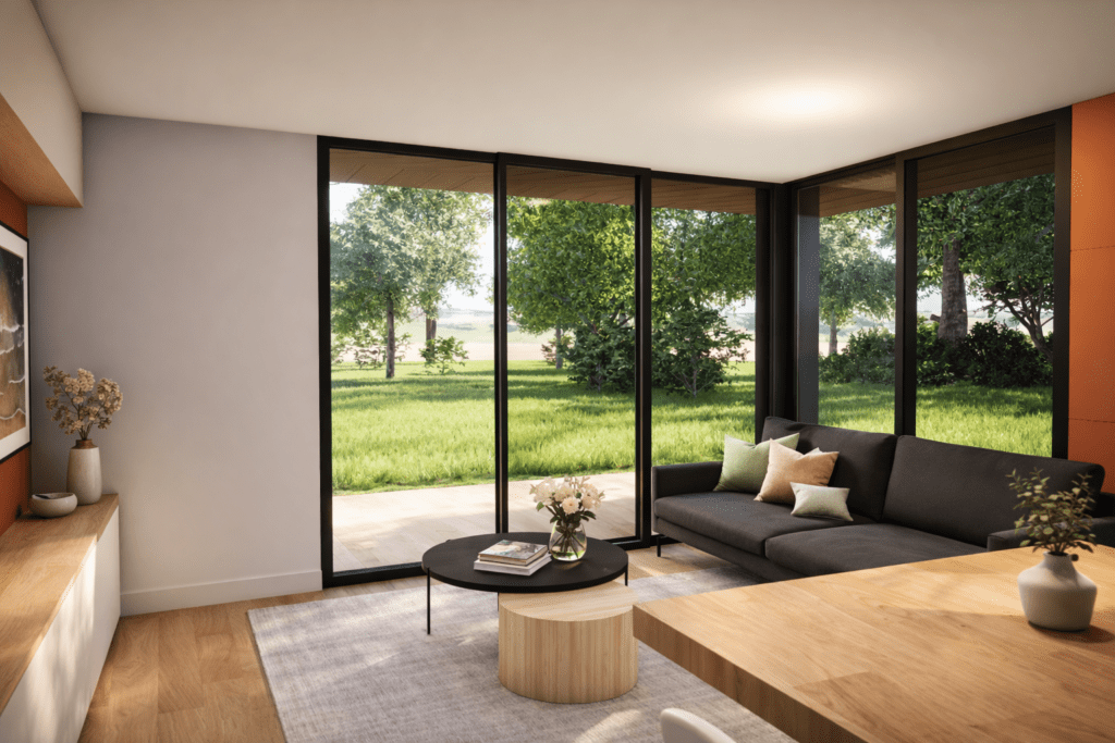 Baignée de lumière, la pièce de vie s’étire vers l’extérieur et dialogue avec la nature environnante, affirmant une architecture sobre, durable et tournée vers l’essentiel, où le confort d’usage et la relation au paysage guident chaque choix.