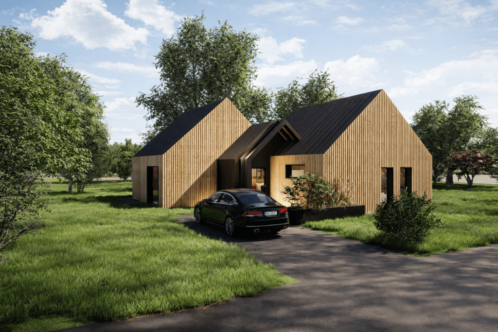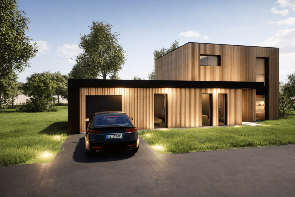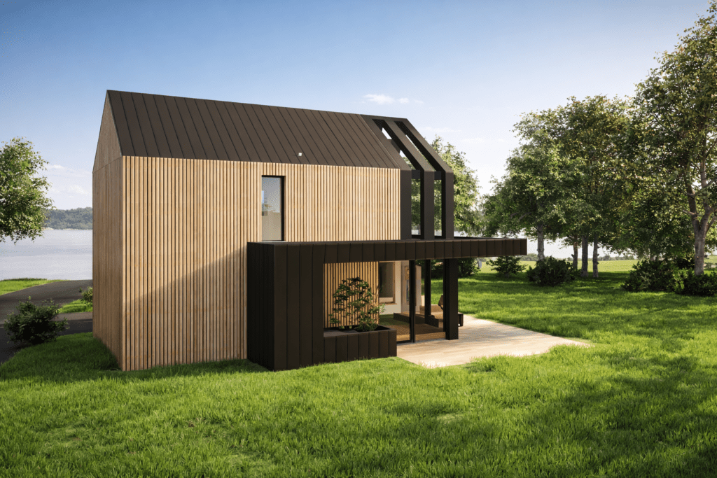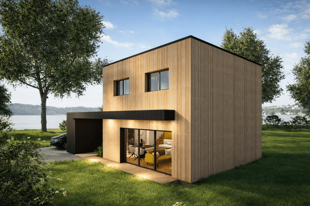 Construite avec une structure bois, la Hytte conjugue esthétique contemporaine, performance thermique et durabilité, pour une maison élégante, et chaleureuse.